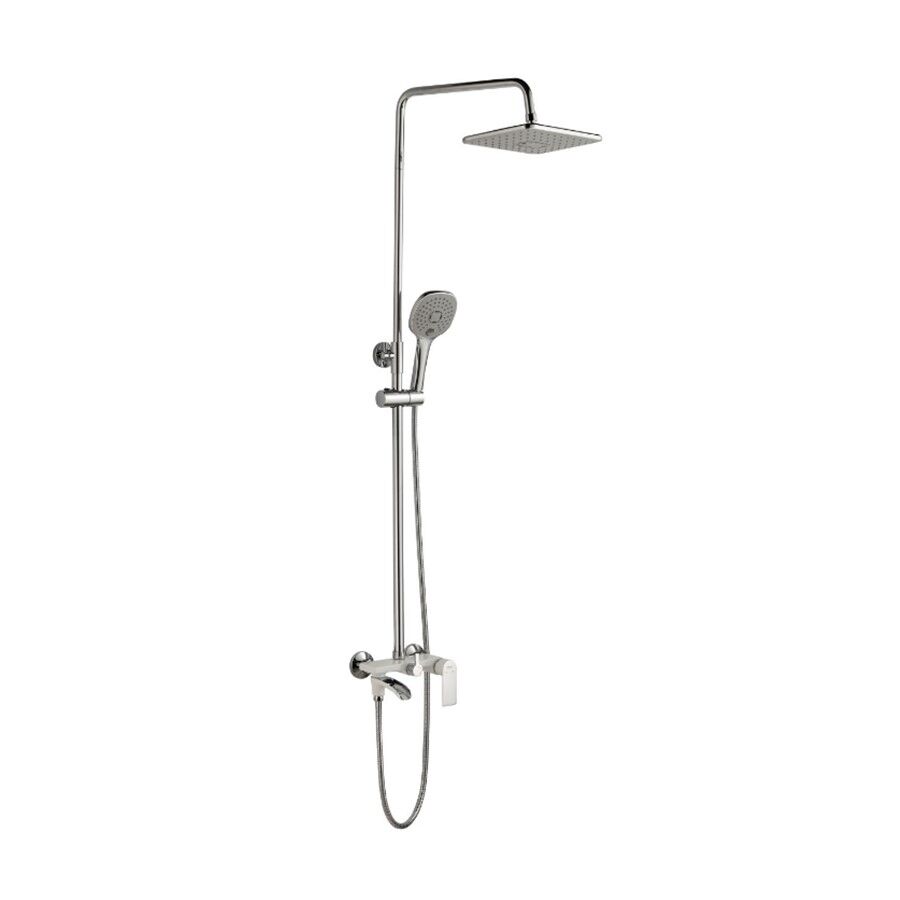 - Комплектация: верхний душ, душевая штанга, держатель душевой лейки, ручной душ, смеситель, шланг