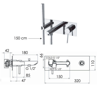 - В комплекте: скрытая часть, ручной душ, шланг