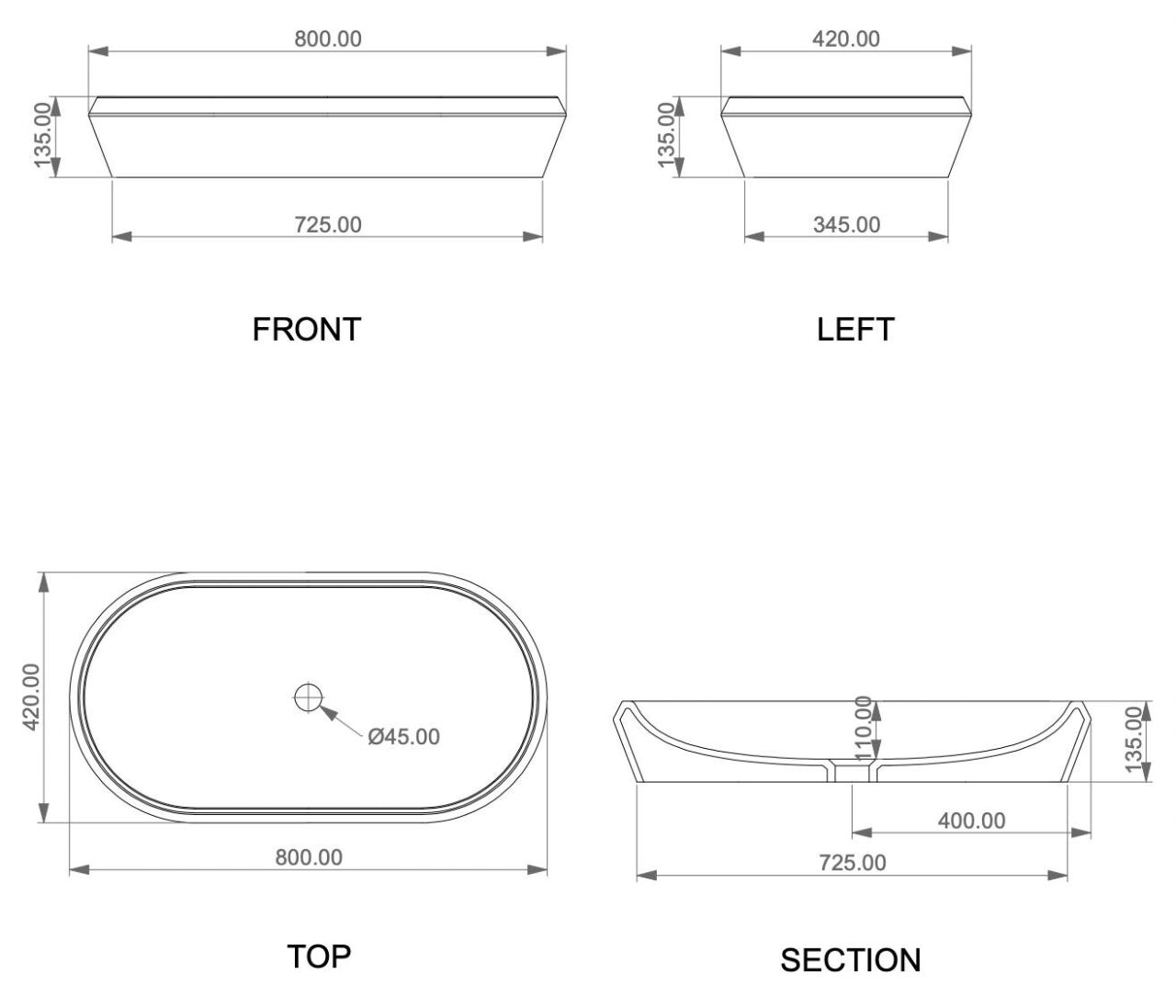 - Диаметр сливного отверстия, мм: 45